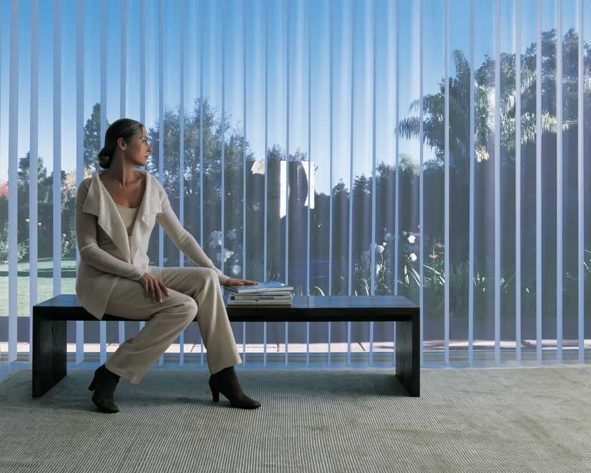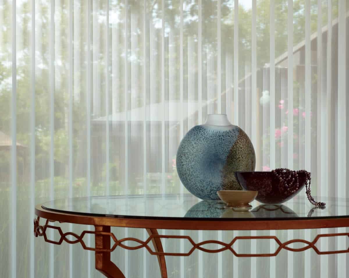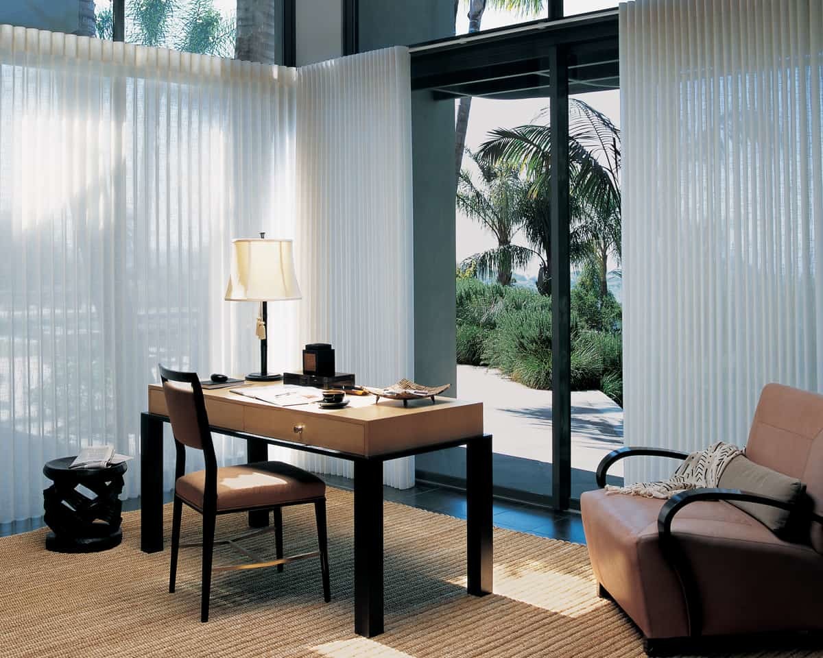 Luminette Privacy Sheers from Hunter Douglas use soft-face fabric that is permanently bonded to fabric vanes. These can be tilted for optimal light and privacy control. When the vanes are in the open position, the soft-faced fabric provides a beautiful, diffused glow, while still providing an exterior view. When the vanes are closed, the privacy sheers are completely opaque. As an authorized dealer and installer of Hunter Douglas window coverings, Slats Blinds is proud to offer Luminette Privacy Sheers for your home or office.
